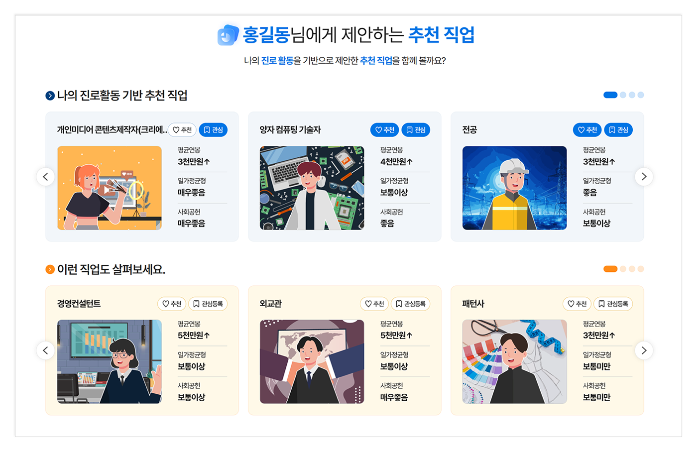 나의 진로 데이터를 가지고 좋아할 만한 콘텐츠를 먼저 추천해요.