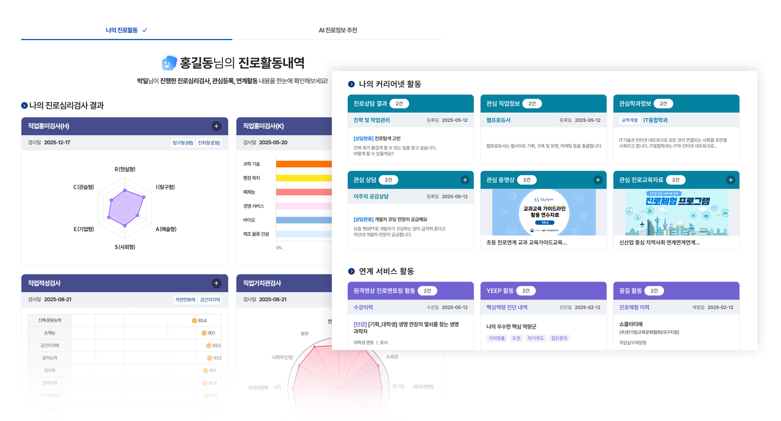 주요 검사 결과와 나의 진로 검사 변화를 그래프로 볼 수 있어요!